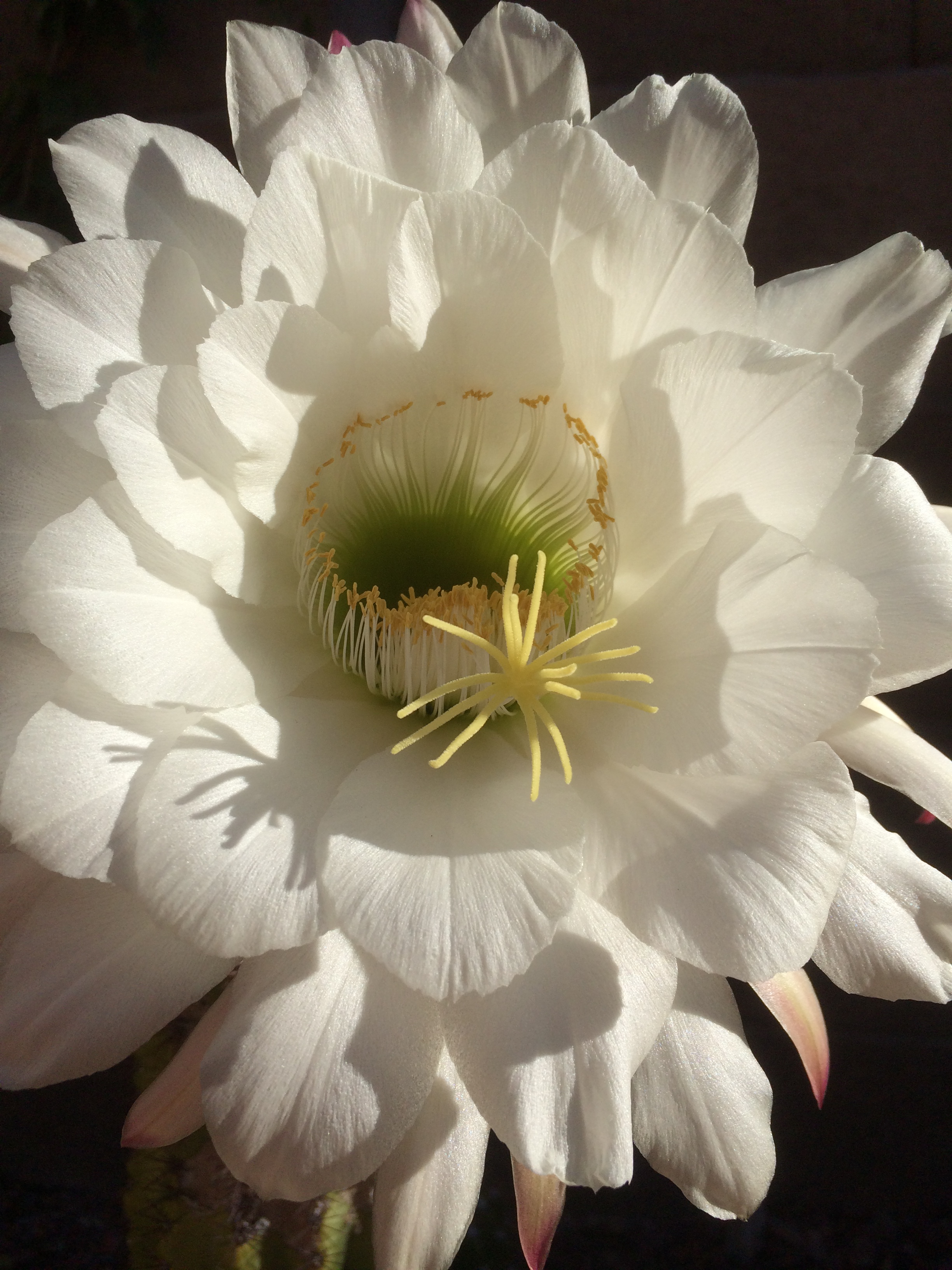 This delicate creation that overnight had popped out of a squatty, very average, run-of-the-mill cactus plant, was breathtaking. Radiant in the morning sun. Gleaming white tinged with soft pink around the edges. The symmetry in the center. One long golden arm reaching out to invite and welcome pollen gatherers. The circular inner pool lined in peaceful green. Petals that seemed spun of cloud and mist. And then astonishment slowly turned into awe. For here before me was a glorious example of the interrelatedness of life, the coming together in one moment of elements and substances that produced the tangible reality of beauty. For a moment I was no longer admiring a lovely flower, but looking instead at the conjunction of air, and wind, and rain, and sunshine, and rich soil, and living nutrients, and molecules, and atoms, and mystery. For about two days these quiet elements have come together to be transformed into the visible manifestation of sheer beauty. After two days, the cactus flower will be gone. It will dry up and droop, eventually fall off its host onto the ground, then disappear into the dirt.