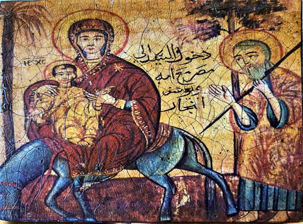 As a window or a portal, the Icon is a very valuable resource for someone wanting to probe new dimensions of spiritual consciousness. Let’s spend a moment with the Icon above, and let me make a couple of observations. What quickly comes to mind is the biblical story of Joseph, Mary and the infant Jesus in their flight to Egypt when Herod announced the deaths of all male children of a certain age. So, the portal opens for someone who follows the thought pathway of the stressful journey. Think and pray about a fearful journey you have undertaken. Pray for those who are now on such a journey. Let your mind and your heart feel the stress of such an experience. Or, look at their faces. No smiles, no happy countenance. Individually each one feels the dangerous threat. The portal opens and invites you into prayerful meditation on the fears that drive us to run and on the comfort we have in Christ. Or, look at the donkey. Head down, moving very slowly, carrying a heavy burden. See how this works. The Icon pulls you into the story and you become a character, a player.