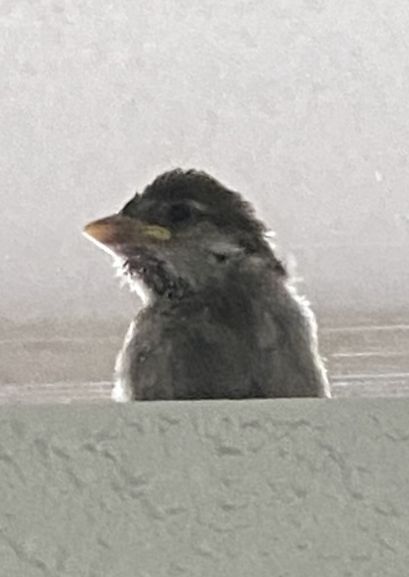 I was walking through the Living Room when, out of the corner of my eye, I saw him peering through the rectangular window above the front door. I think he must be new to this world because he wasn’t frightened and he sat there for a long time listening to me tell him about the neighborhood. I think I might have been the first human he had ever seen because he stared at me for five minutes. Wouldn’t it be amazing to hear what his little bird brain was registering at that moment? I was just explaining some of the HOA rules to him when he suddenly stood up taller at the sound of rapid chirping behind him. He turned and off he fluttered, summoned by a worried Mom who had just counted heads and discovered she was missing one.