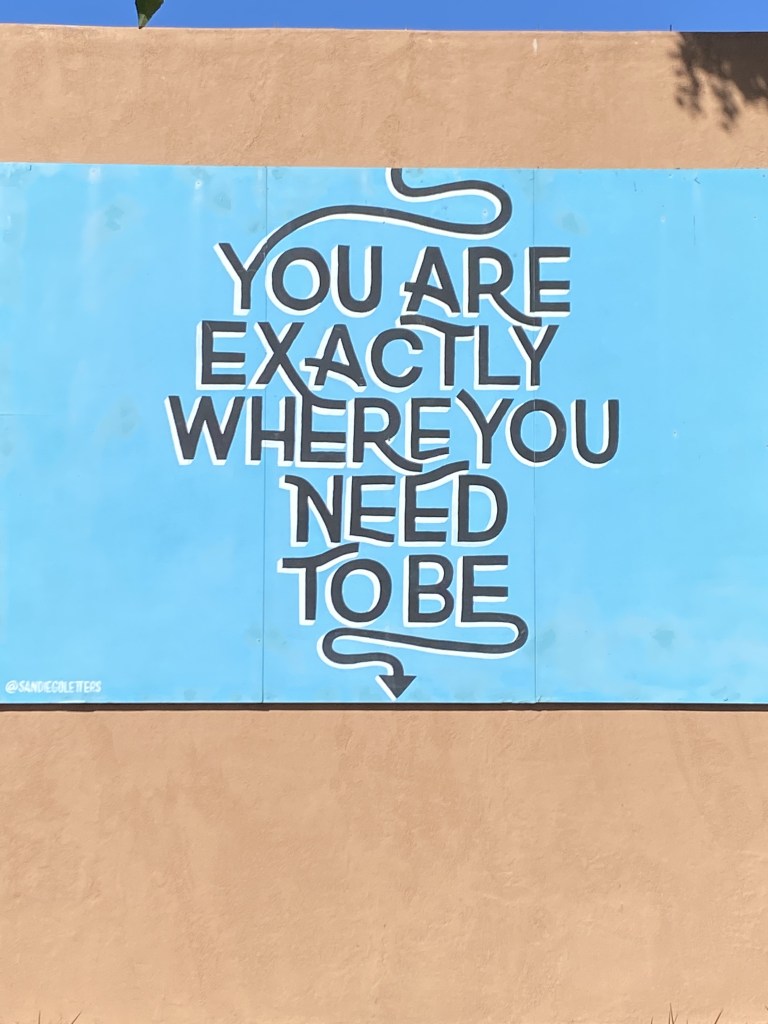 19 AugI have a friend who signs off on all his emails with: “Find a need and fill it.” That’s pursuing life, not waiting for it to come to you. That’s active and intentional. But the “finding” and the “filling” can’t be done unless you know where you are and until you connect with the moment. That is, until I am more aware of this moment and its possibilities than I am of myself and my own desires. To live “in the moment” is to be aware of life at a deeper level than routine and ritual. The sign in the picture above was painted on the side of a building, and I think it expresses the core issue in living an intentional life. “I am exactly where I need to be at this moment.” Not in yesterday or tomorrow, not in what might have been, not in regrets or the dream of tomorrow’s rewards…but right here, right now. How can I live this moment with joy, purpose and integrity? To the person who thinks: “I’ll try that tomorrow. Why the sense of urgency?” I reply: Sit back, take a deep breath and think about what you just said. Those “lilies of the field” don’t last forever.