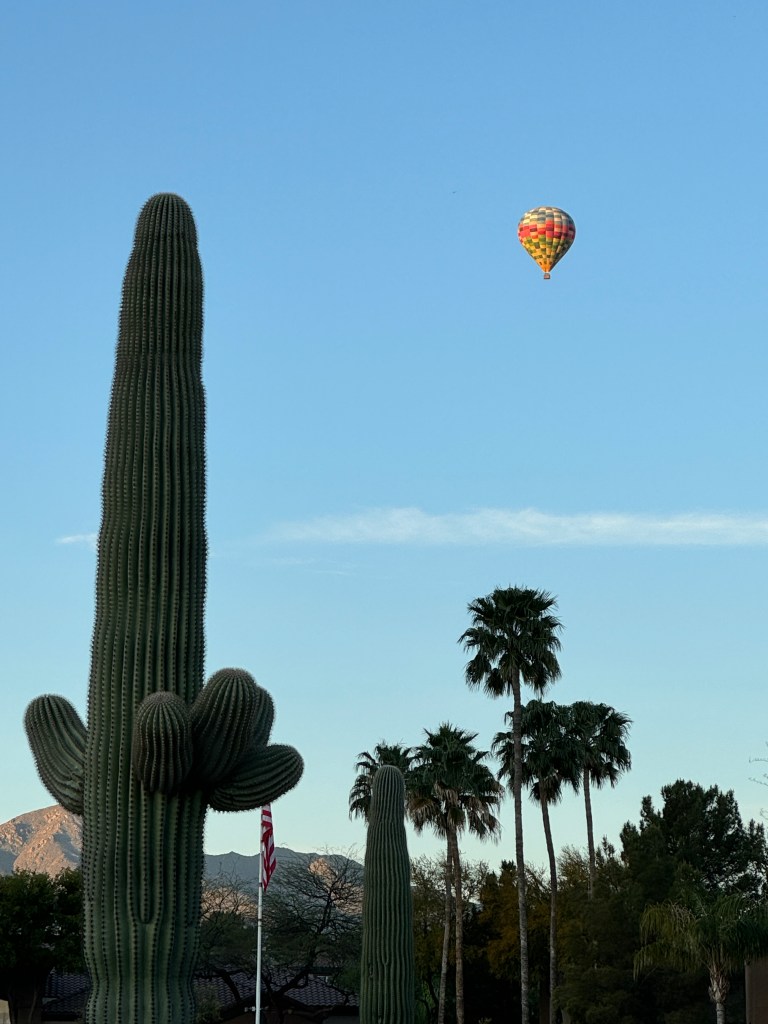 14 AprAnd so I debated with myself this early morning: Should I go down to the Fitness Center for a workout? Or, should I go outside and walk for a couple of miles? Fitness Center: quiet, excellent equipment, comfortable conditions. Outside walk: rather cool this morning, cars and trucks rumbling along, noisy, up and down off of curbs. So, in one of my better instinctual decisions, I went outside. And do you know what I found? Perfect temperature for a walk, very few cars at 5:30 on a Sunday morning, brilliant sunshine, birds singing their hearts out, flowers blooming everywhere, glowing mountains in the distance, and a multi-colored hot air balloon floating just above my head.