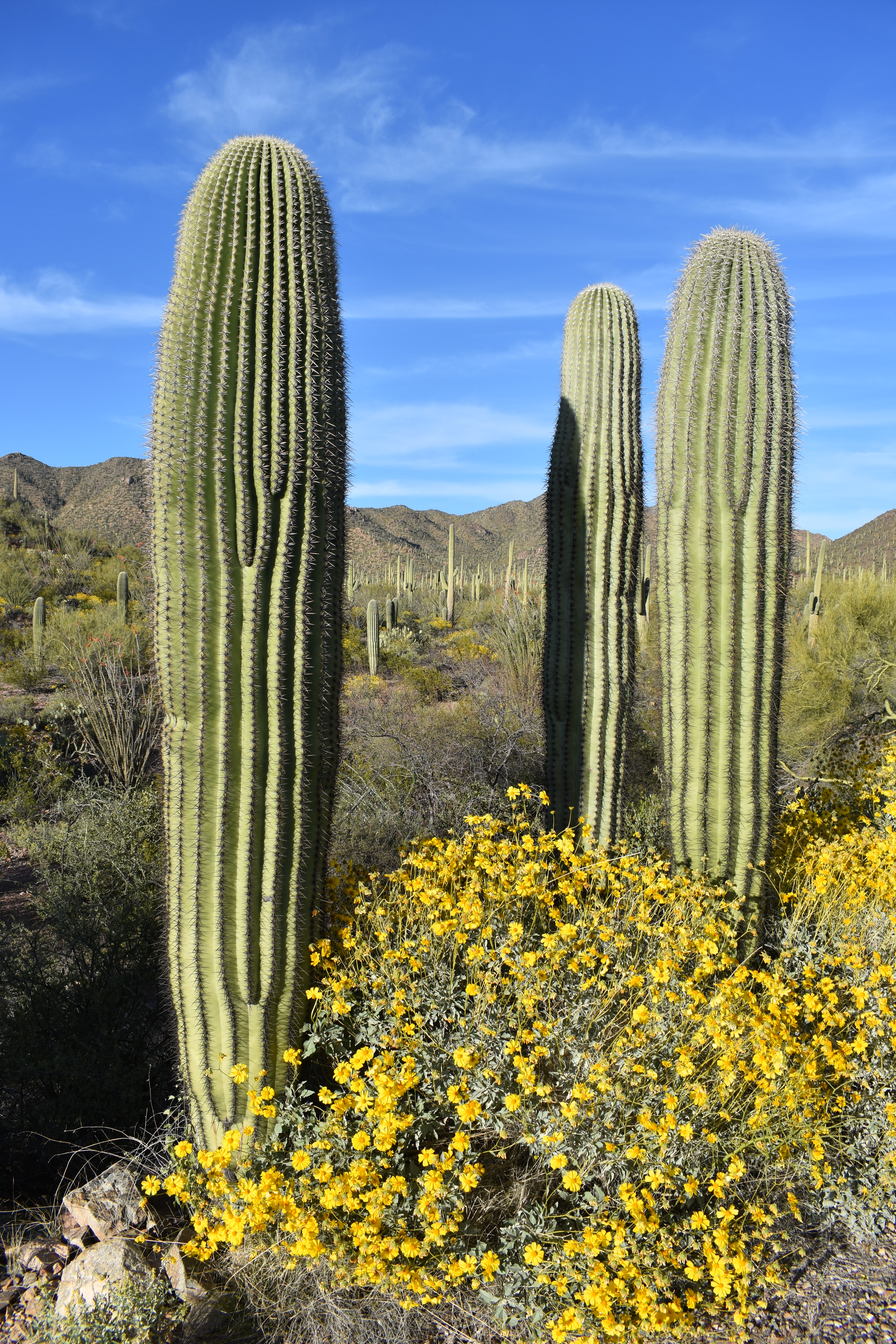 Tall, elegant Sahuaros look down on the desert's