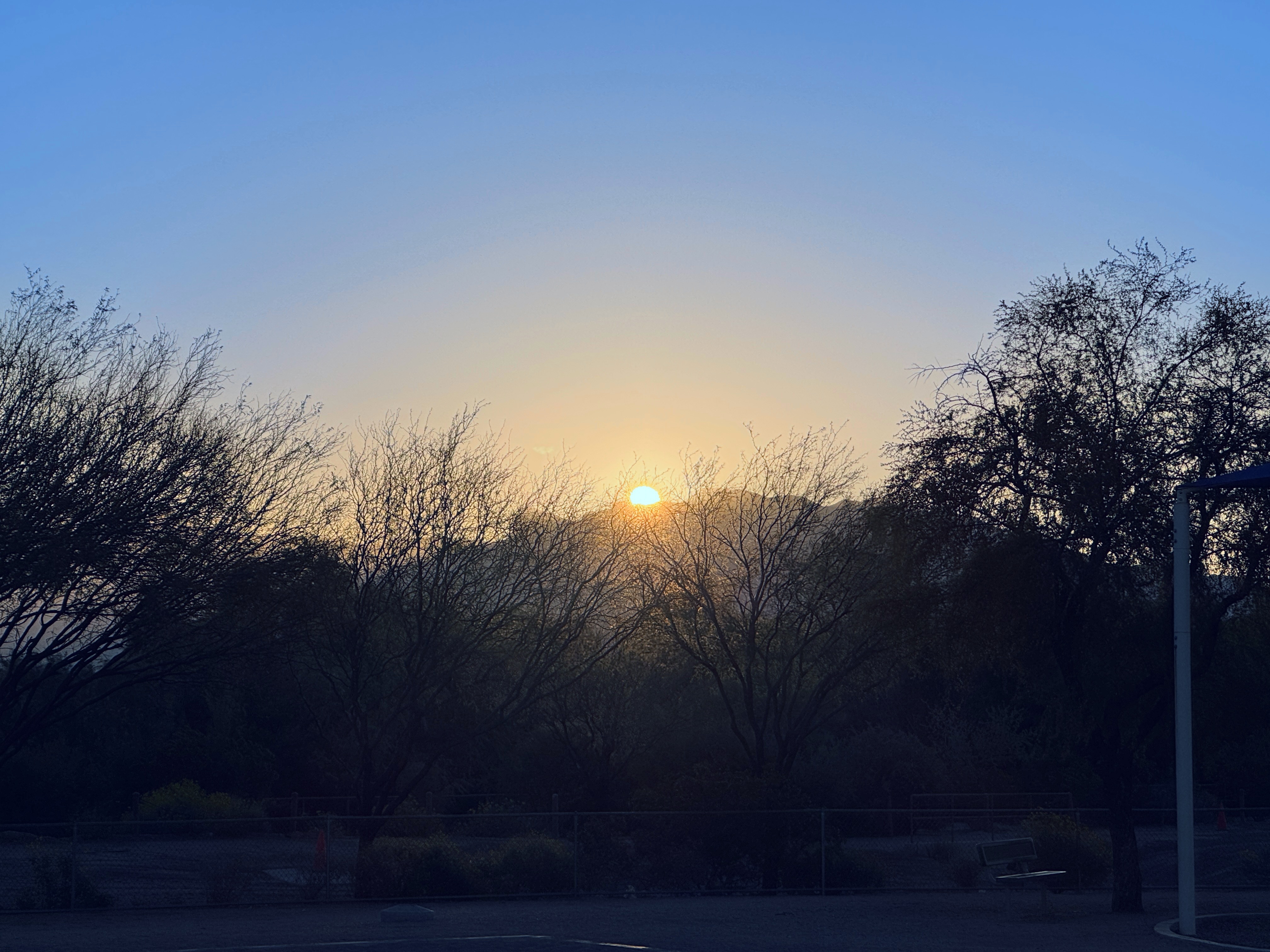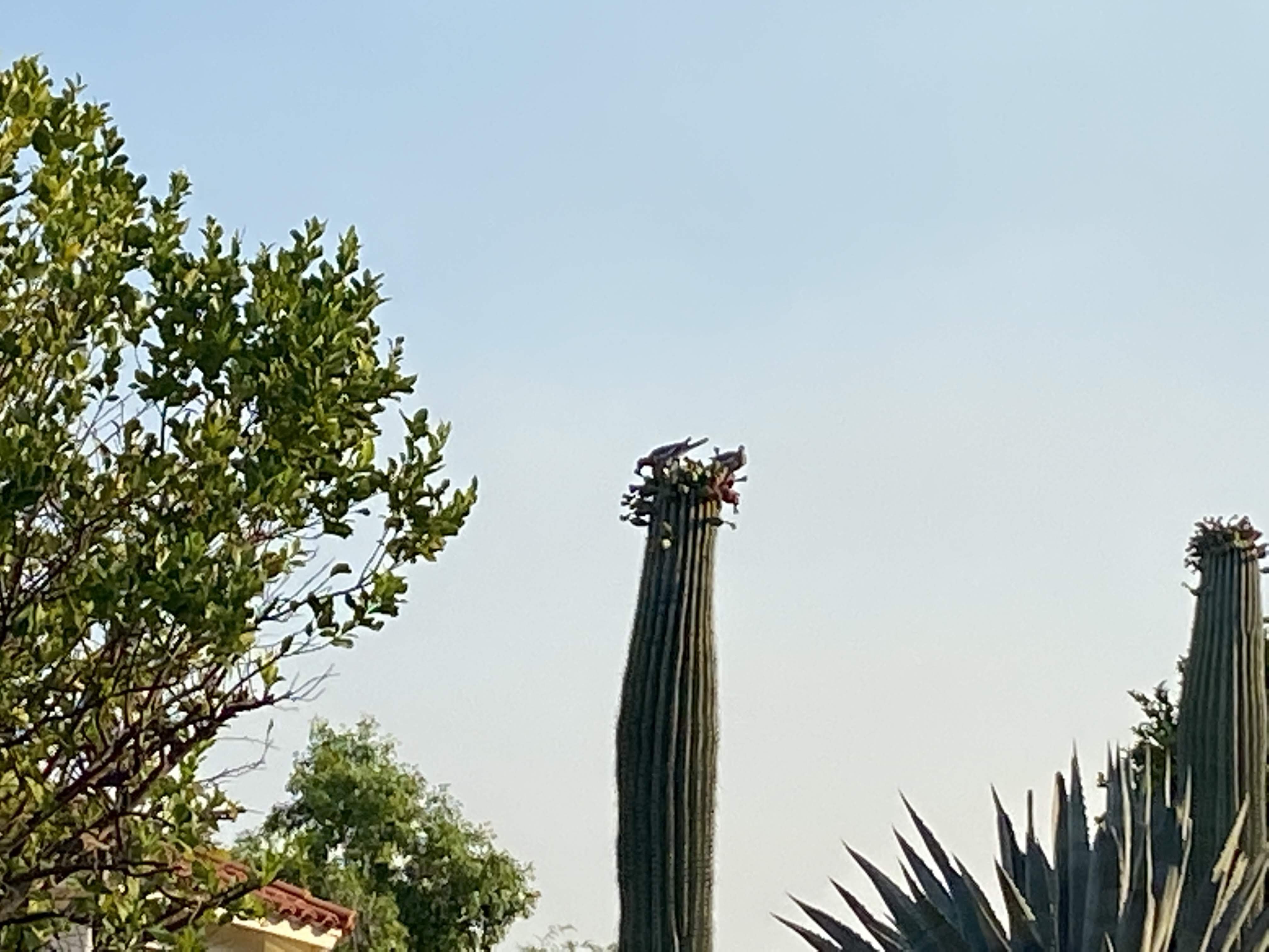 Have you noticed the tops of our stately Saguaros? Little buds pop out, then they open revealing bright white flowers and then the final delight. The pinkish-red fruit appears and the birds turn somersaults of joy. It’s the cycle of life. I find it curiously ironic that the source of the delicious fruit is a prickly, thorn bearing desert giant. A round of applause, please, for the sharp needle Saguaro and their yummy red blossoms. And a word of gratitude, too, to the Author of life who brings all things into existence and provides our “daily bread.” The next time you see a flower-top Saguaro, say hello. But, no hugs.