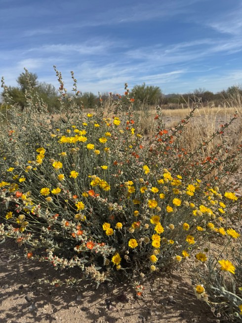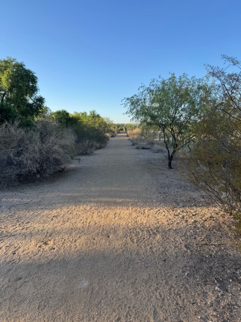 24 MayThe route of my morning walk. To my far left is the Santa Cruz River, at this point in its journey, a singing, bubbling waterway lined by tall shade trees. Then to my immediate left, between me and the river, is the wonderful bike/walking loop that circles the entire city of Tucson. It has been very recently resurfaced and stripped so that it is even more appealing than it was in its original state. Cyclists whiz by and walkers stroll along. It is a great way to start the morning. But as lovely as those two features are, I am drawn to the dirt trail in the photo. I find it refreshing and more in keeping with my desire to experience the subtle relatedness of human and earth. I think it’s the crunch of the gravel. Planting my foot on the earth seems more satisfying than walking on asphalt. Try it sometime. Listen to the earth speak. You might even consider taking your boots off and walking barefoot through green grass in a nearby park. Of that I can only dream. Green grass in the Sonoran Desert is a contradiction in terms. And even if I found some, it would be a short walk.