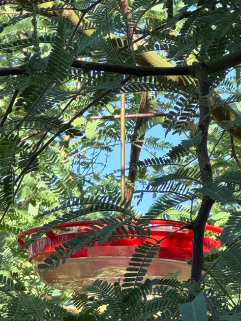 When the little fragment of feathers we call a Hummingbird spies that red color in the tree branches, she knows by instinct that something nourishing, refreshing and tasty might be inviting her for a stop. She investigates. And, sure enough, the drink tastes wonderful She perches on the red railing, aligns her long beak with the small hole that is the opening to the sweet liquid, and then, bowing low to make sure her long tongue touches the sweetness, she takes her fill. She bows, as if she knows to be appreciative, to say thank you. I’d like to think that her bowing is not just a physical necessity, but also an inherent recognition of how life provides for her blessing and welfare. The red feeder did not appear in the branches all by itself. It was put there by hands and a heart of caring, and she “bows” in gratitude for the common thoughtfulness that connects all living things.